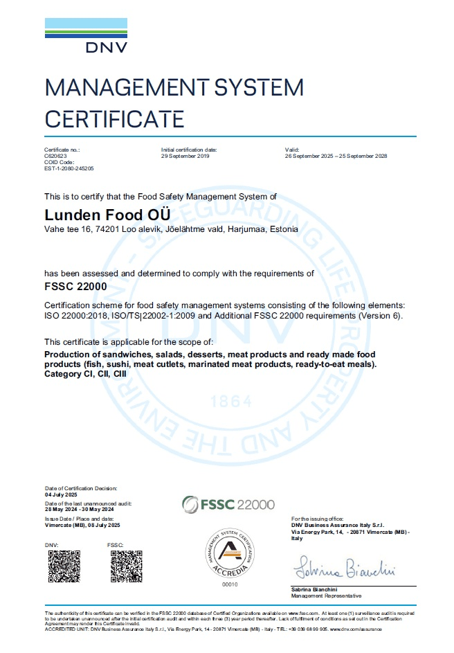 Omame 2019. aastast FSSC toiduohutuse sertifikaati - meie jaoks on väga oluline pakkuda tarbijatele kvaliteetset ja ohutut toitu. Pöörame tähelepanu ostetava tooraine päritolule ja koostisosadele, kasutame aastast 2021 ainult puurivabade kanade munasid ja puurivabade kanade mune sisaldavad tooraineid.