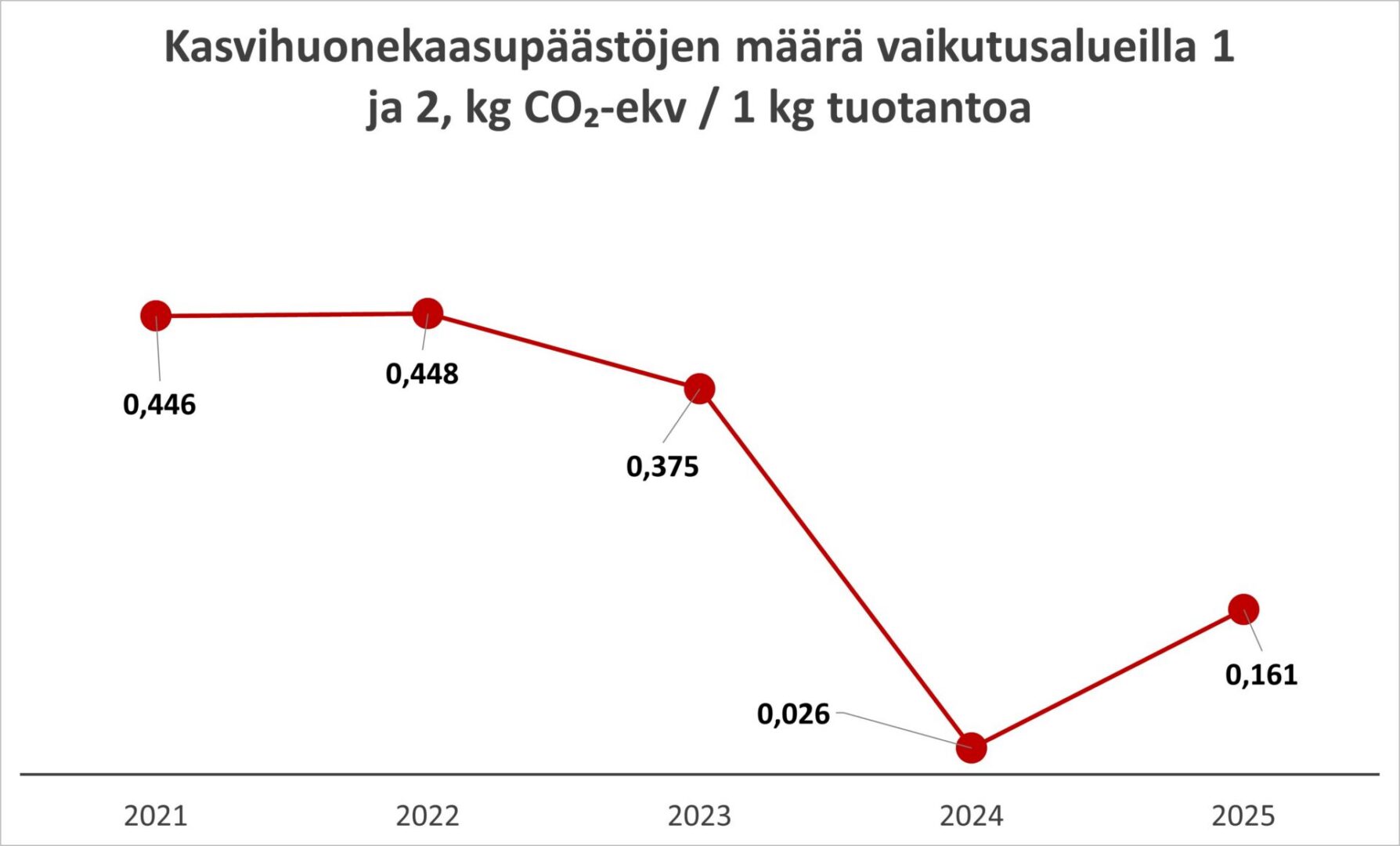 V. 2021 lähtien olemme mitanneet kasvihuonekaasujen jalanjälkeä 1. ja 2. vaikutusalueella. V. 2023 asetimme lyhyen ja pitkän aikavälin tavoitteet kasvihuonekaasujen vähentämiseksi.